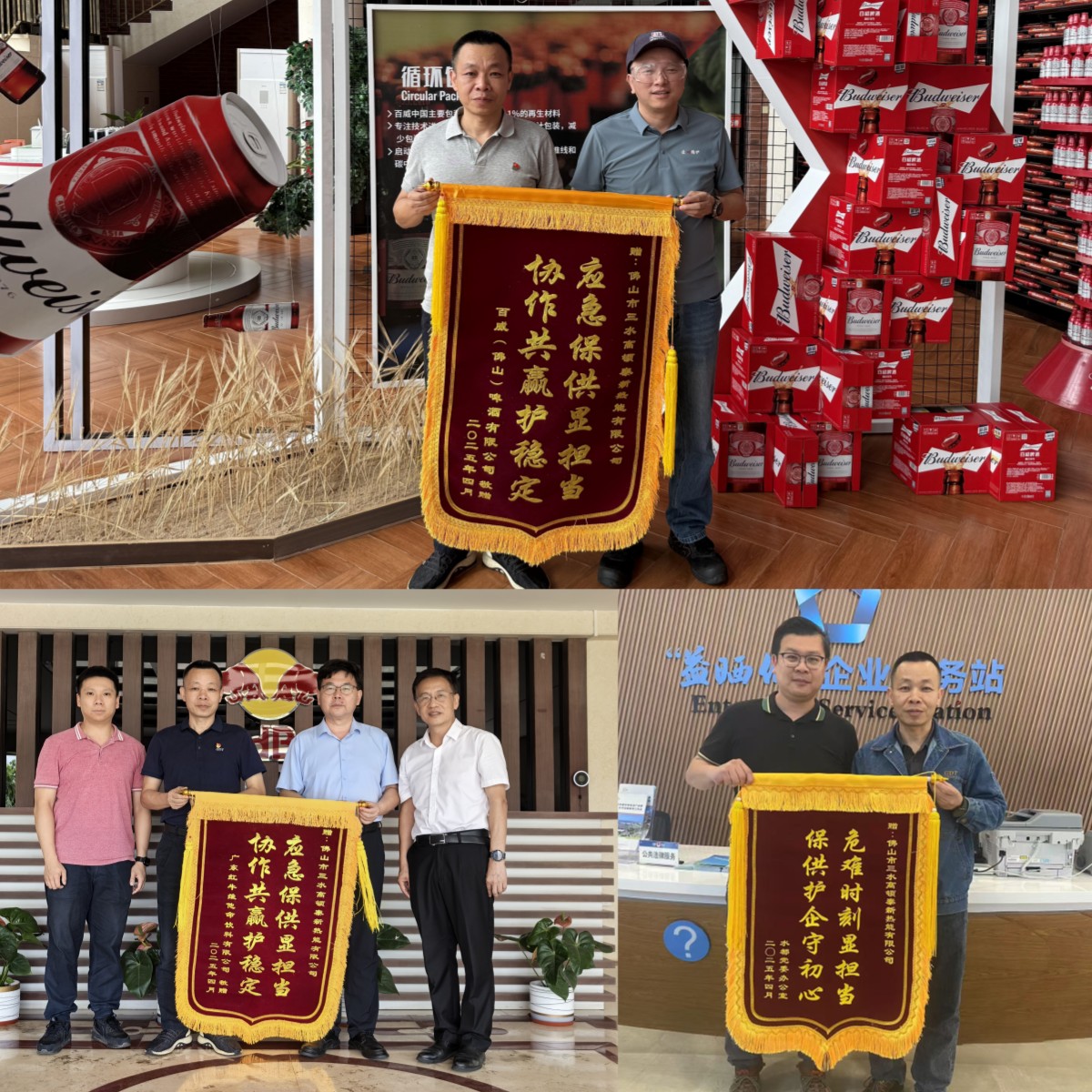 为表彰高顿泰公司在保供攻坚中的突出贡献:水都党委办公室特授予“危难时刻显担当 保供护企守初心”锦旗;园区重点用汽企业广东红牛维他命饮料有限公司、百威(佛山)啤酒有限公司相继致赠“应急保供显担当 协作共赢护稳定”锦旗。以上荣誉是水都园区政企对高顿泰公司关键时刻挺身而出、勇于担当的充分肯定,更是对“国企姓党、服务为民”初心的生动映照。