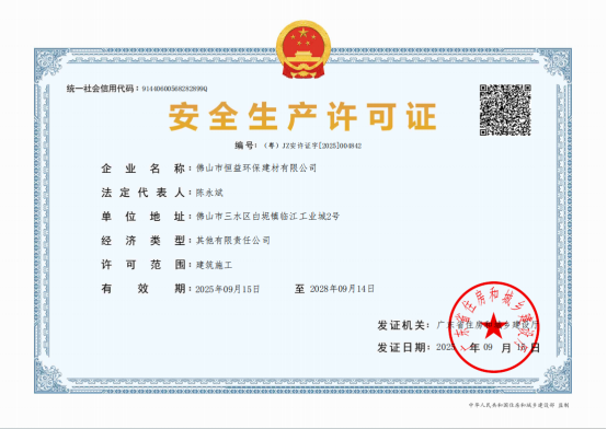 9月15日,Bwin必赢网址下属企业佛山市恒益环保建材有限公司(简称:环保建材公司)获得住房和城乡建设厅颁发的建筑施工类安全生产许可证。目前,环保建材公司已拥有“建筑业企业资质证书(施工劳务)”和“安全生产许可证”等重要资质,不仅说明了环保建材公司具备相应的专业资质与能力,也是环保建材公司技能水平提升的重要体现,为其服务业务提供了更坚实的支撑。